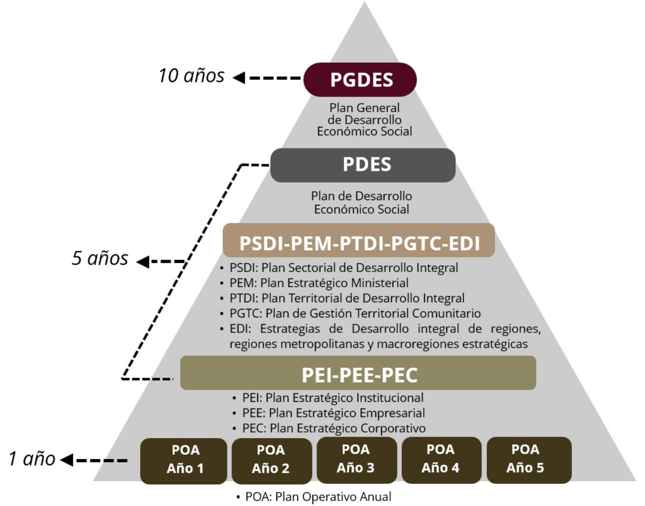 De estos se desprenden, los planes sectoriales, territoriales, institucionales y de empresas públicas, en el mediano plazo y los planes institucionales y empresariales de corto plazo.